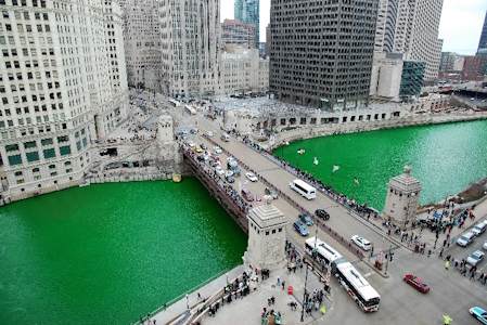 Річка з’єднує Великі озера та Мексиканську затоку, загальна довжина її сягає понад 250 км. У результаті бурхливого промислового розвитку міста в XIX ст. води річки забруднювалися, а після сильних дощів і потопів у місті спалахували епідемії. Тому в 1900 році річище перенаправили до басейну річки Міссісіпі. Це єдина у світі річка, що тече задом наперед. У межах міста через неї перекинуто 38 розвідних мостів. А щороку на День святого Патрика річку фарбують в яскраво зелений колір. Звісно ж, використовується лише екологічно чиста фарба – рослинна.